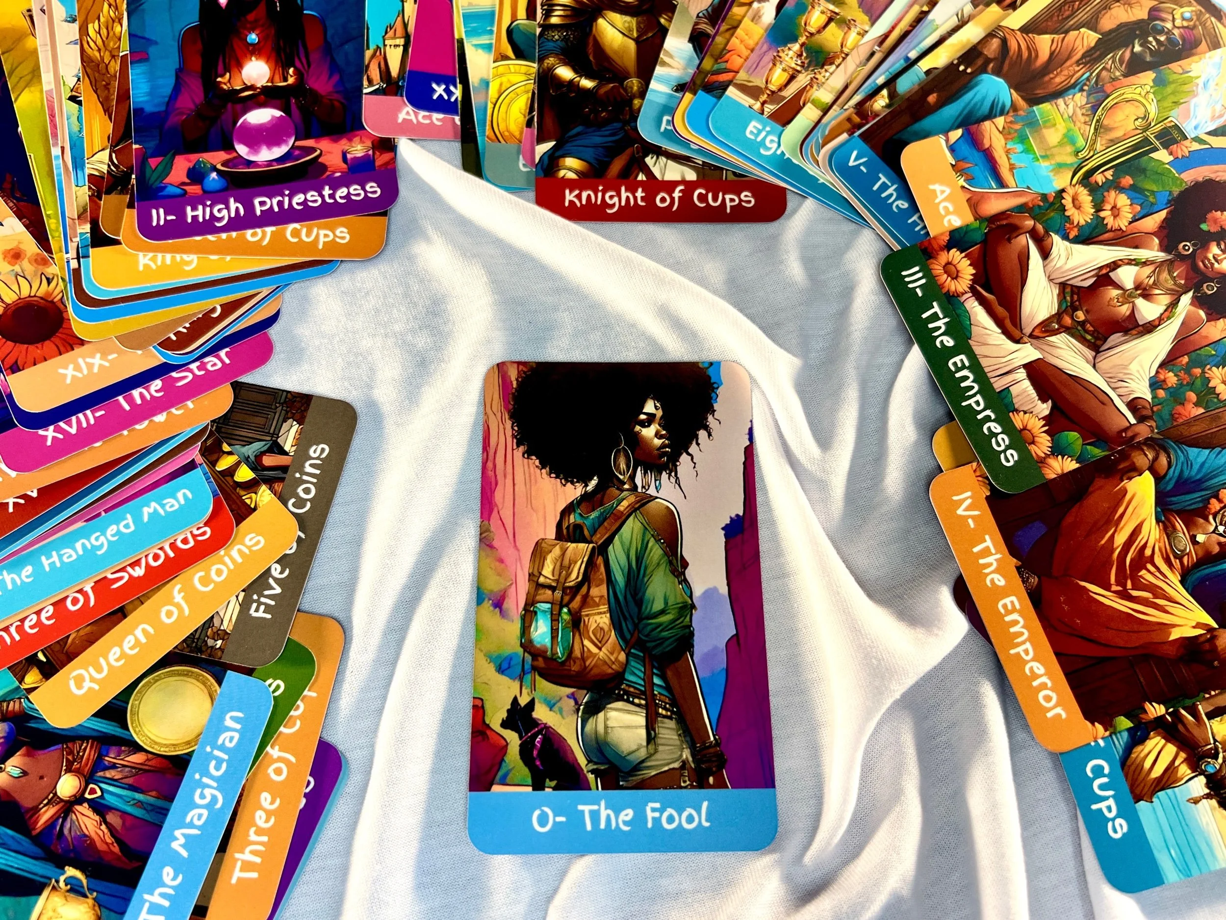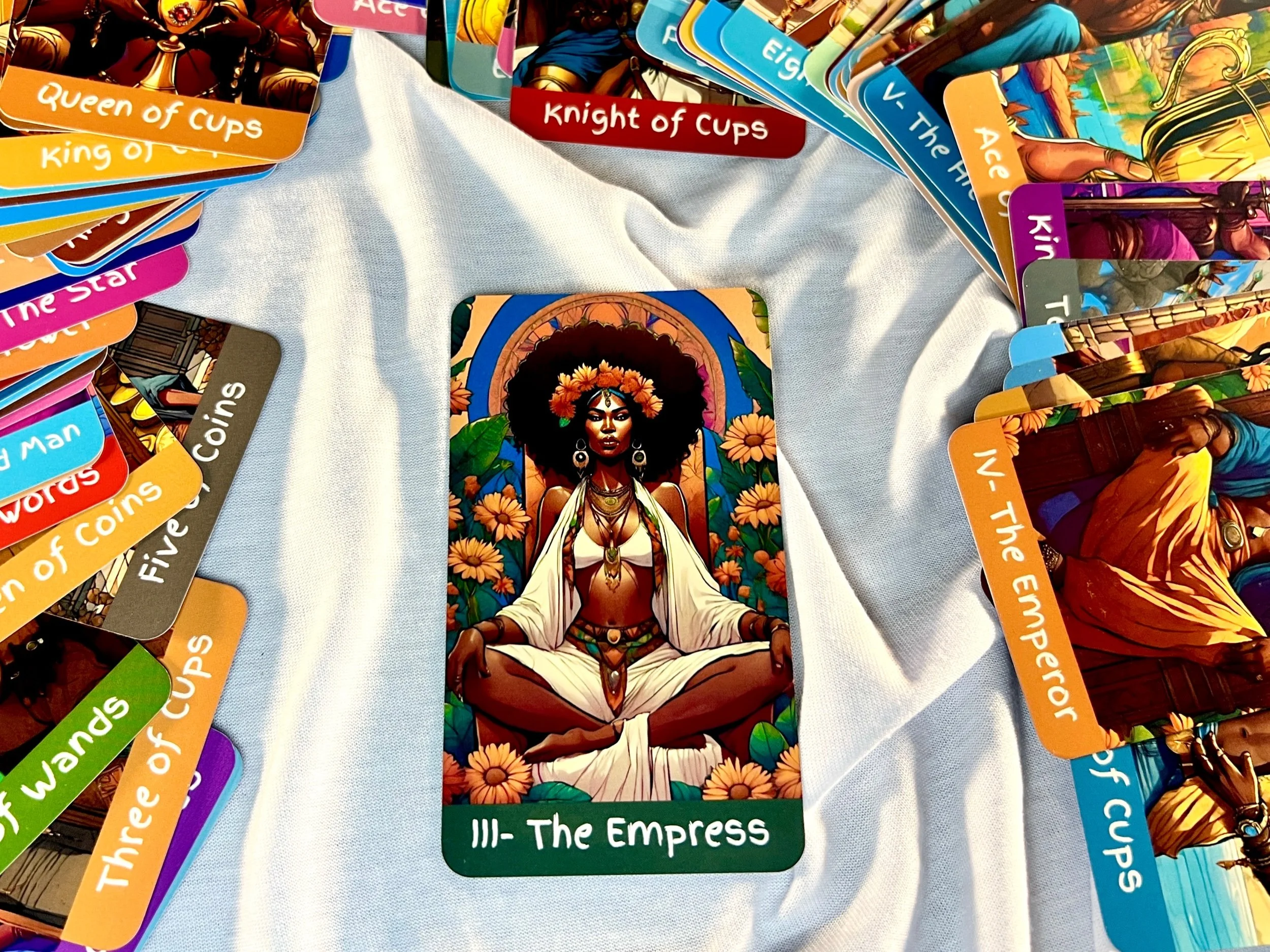 Drafted by Enlightened Ones Tarot’s owner and founder a Black American Tarot reader with over 25 years of experience, this 78-card deck is a tribute to the magic of Melanin skin tones and traditional Tarot. Each vibrant card is a masterpiece, celebrating spirituality and inviting you on a powerful, transformative journey. Offering profound guidance and insight, it's an essential tool for connecting with your inner divinity and navigating your life's path. Embrace the powerful Melanin Goddess beauty with every draw!